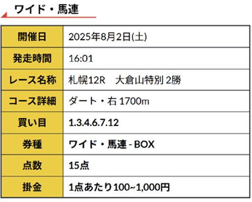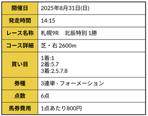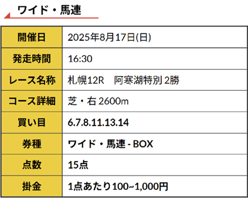 2025.8.17 札幌12R(馬連) | +18,100円 | ◎ |
