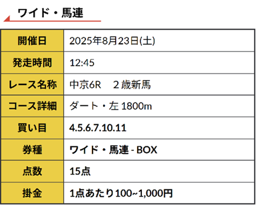 2025.8.23 中京6R(馬連) | +10,600円 | ◎ |