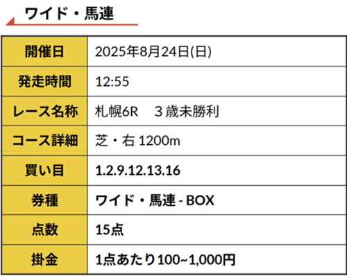 2025.8.24 札幌6R(馬連) | +22,800円 | ◎ |