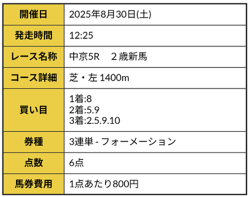 2025.8.30 中京5R(3連単) | -4,800円 | ✕ |