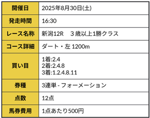 2025.8.30 新潟1R(3連単) | +329,580円 | ◎ |