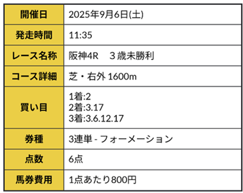 2025.9.6 阪神4R(3連単) | +671,520円 | ◎ |