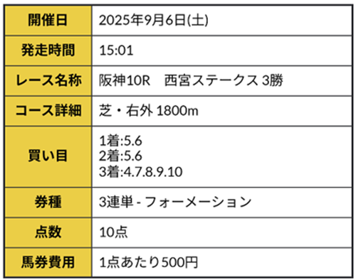 2025.9.6 阪神10R(3連単) | -5,000円 | ✕ |