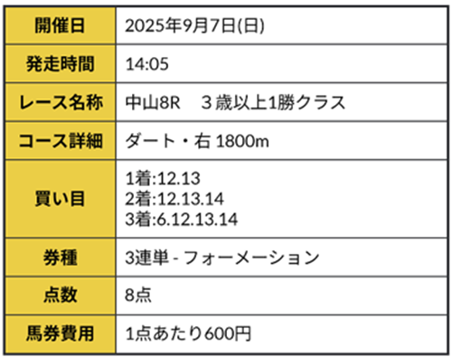 2025.9.7 中山8R(3連単) | -4,800円 | ✕ |