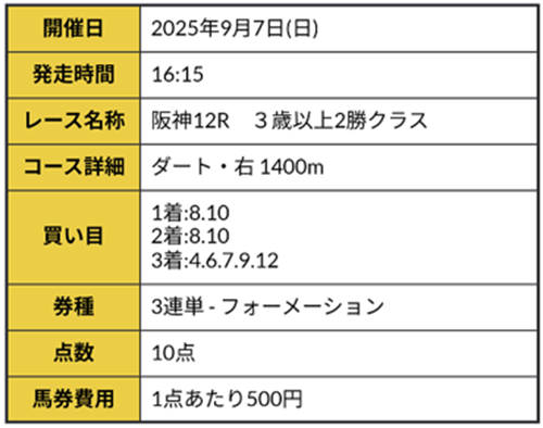 2025.9.7 阪神12R(3連単) | -5,000円 | ✕ |